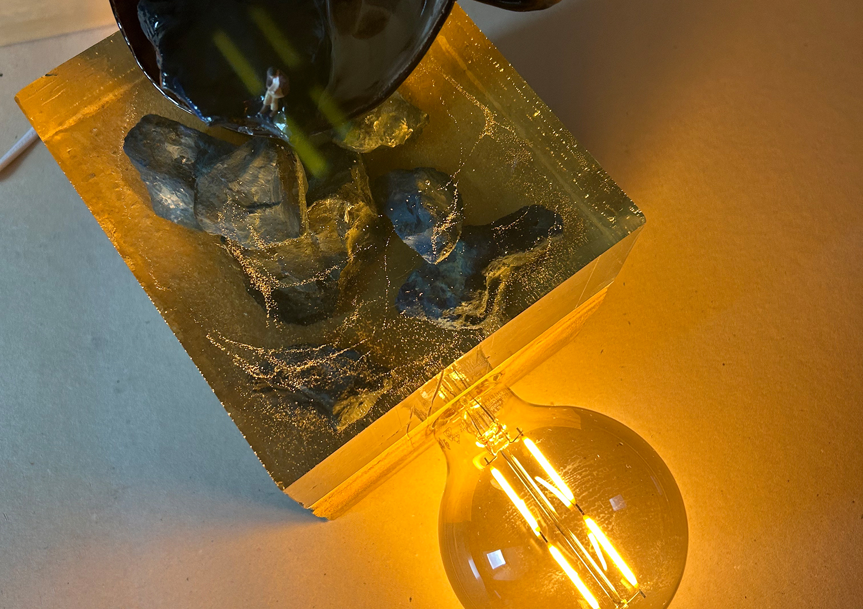 Die Idee zu „on the rocks“ kam mir beim Spazierengehen. Ich gehöre normal nicht zu den Menschen die Steine sameln. Aber an diesem Morgen lachten mich ein paar Steinschiefer an. Also, mitgenommen und zu Hause ausgebreitet… und, weiter drüber nachgedacht. Die Steine waren dann irgendwann mit Acrylfarben bemalt. Und die Idee, diese in Epoxithart einzugießen gab es schon von Anfang an. Die seitlich angebrachte Retro-Glühbirne ist mal etwas anderes. Die eingegossene Keramiktasse ist noch einmal mit Epoxitharz ausgegossen und anschließend wurde ein besonders schöner Stein als Sitzfläche für die Leseratte platziert. Ein toller Blickfang und eine noch bessere Leselampe.