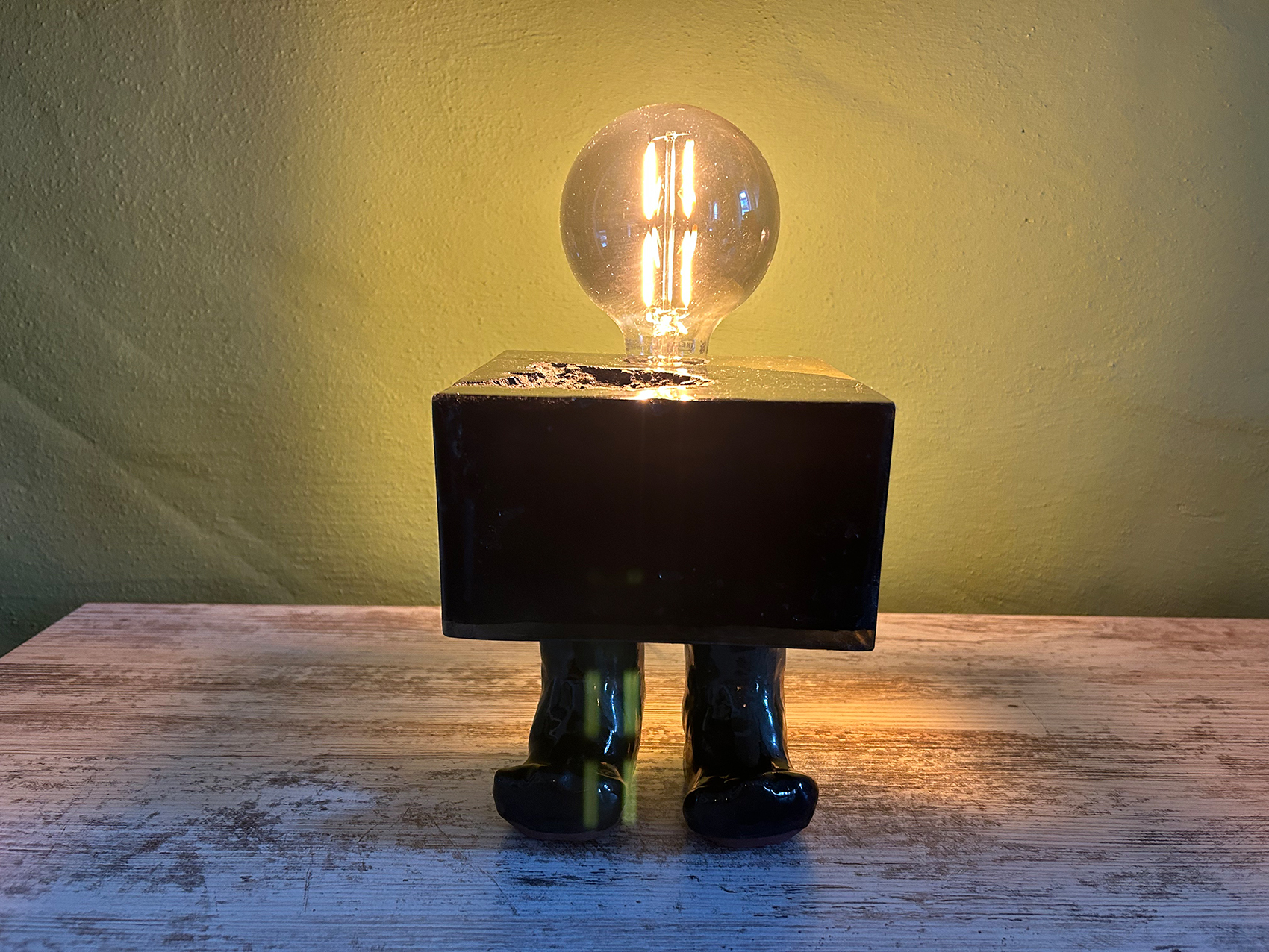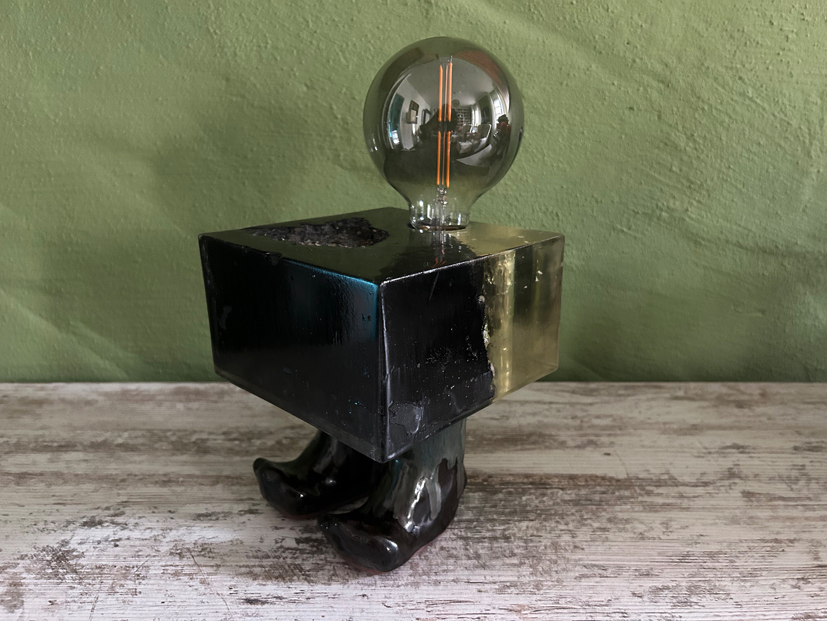 „Step One“ ist ein spektakuläres Objekt mit keramischen Füßen. Die Füße tragen einen Quader aus Beton. Dieser wiederum wird von einer Schicht Kunsthart umhüllt. An der oberen Seite ist ein Stück des Quaders freigelegt und der rohe, mit schwarzen Pigmenten eingefärbte Zement kommt zum Vorschein. Die Kombination aus glänzendem Hart und natürlichem Material geben diesem Lampen-Objekt einen ganz besonderen Look. Du willst es bei Dir zu Hause haben. Du kannst es haben. Das Objekt steht zum Verkauf.