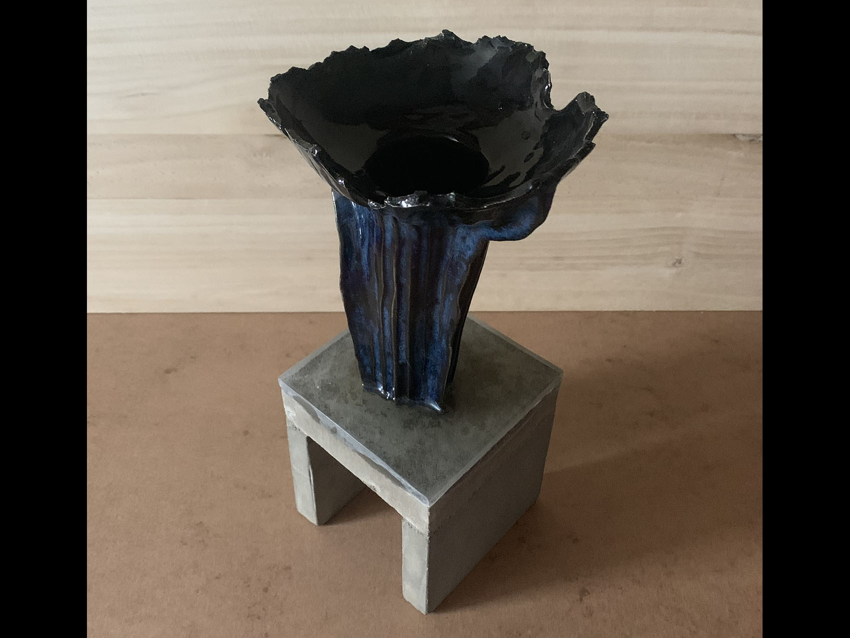 Tulip ist eine Komposition aus verschiedenen Stilen, Elementen und Materialien. Der massive Fuß besteht aus zwei Betongüssen. Die seitlichen Mauern sind im Nachhinein an den Boten angegossen worden. Das geht bei Beton problemlos, da er im flüssigen Zustand ätzende Soffe enthält, die sich hervorragend und fest miteinander verbinden. Gecoverd ist der Betonboden mit einer ca. 1 cm starken Schicht aus Epoxidharz. An den Seiten geschliffen passt es hervorragend zu Beton. Die glänzende Oberfläche wirkt wie ein Spiegel zum filigran geformten Aufsatz aus Keramik. Der Eindruck wird erweckt, als würde die Vase (als was man diese Skulptur durchaus nutzen kann) mit dem Betonblock verschmelzen.
